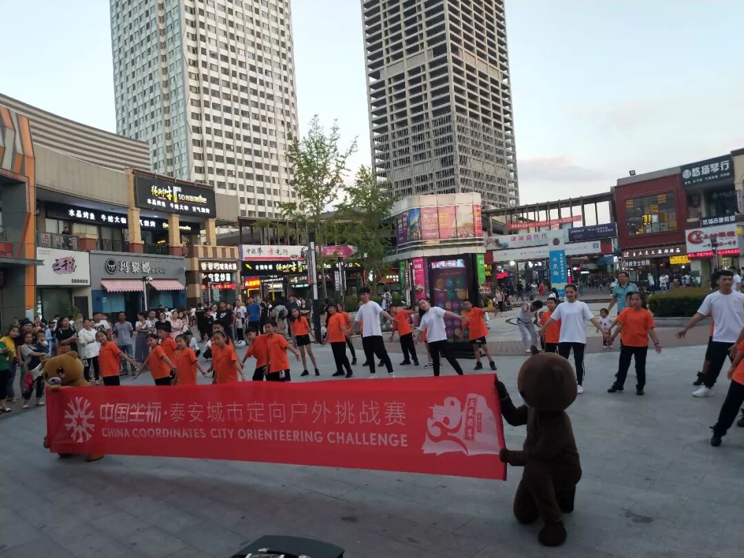 随着音乐结束,两个可爱的小熊拉开了中国坐标·泰安城市定向户外挑战赛的条幅,路人纷纷鼓掌叫好,举起相机拍照。