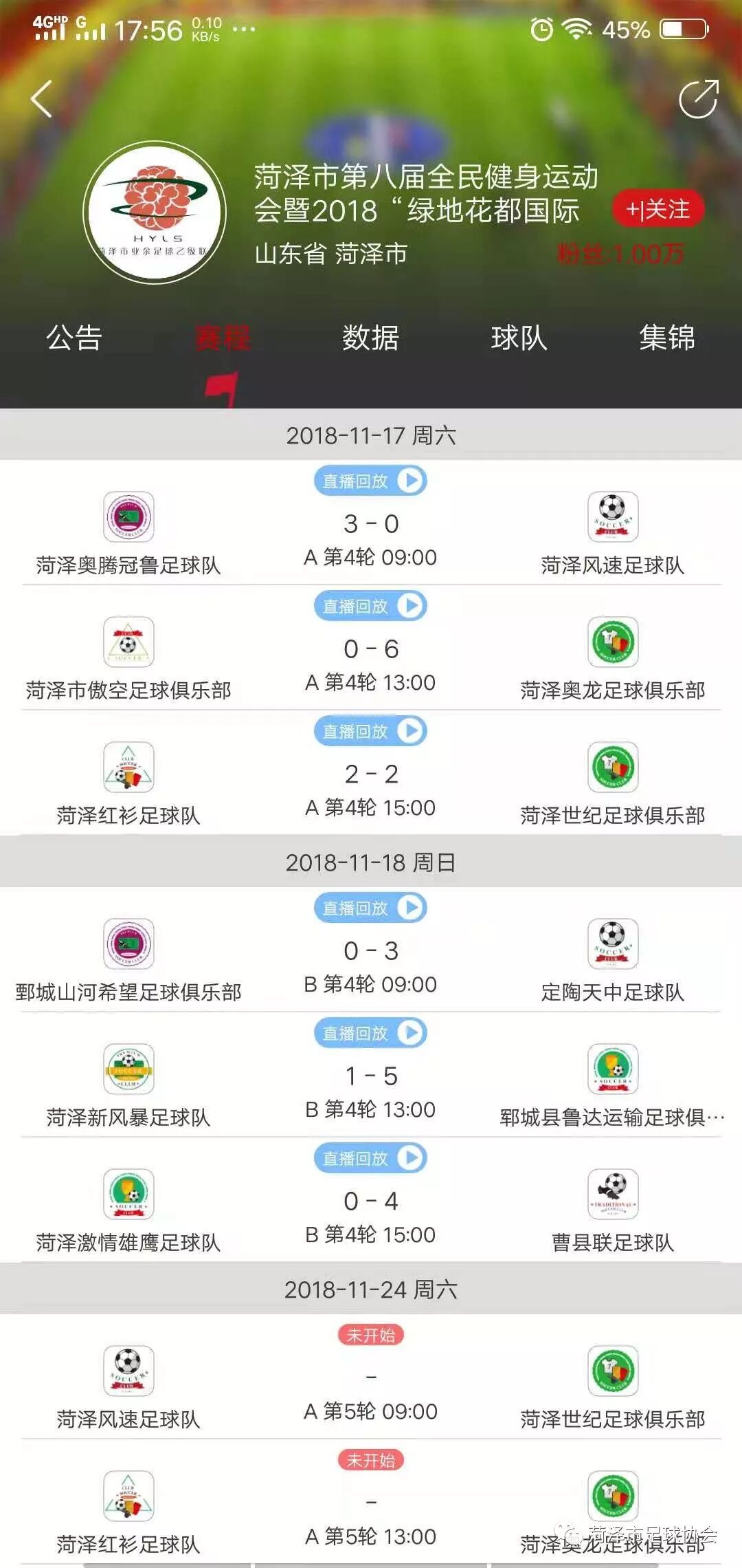 菏泽市第八届全民健身运动会暨2018“绿地花都国际杯”菏泽市业余足球乙级联赛第四轮战况