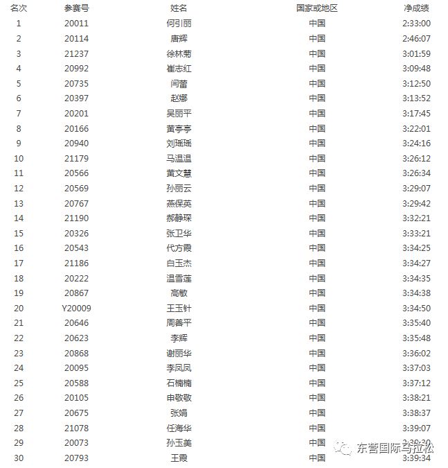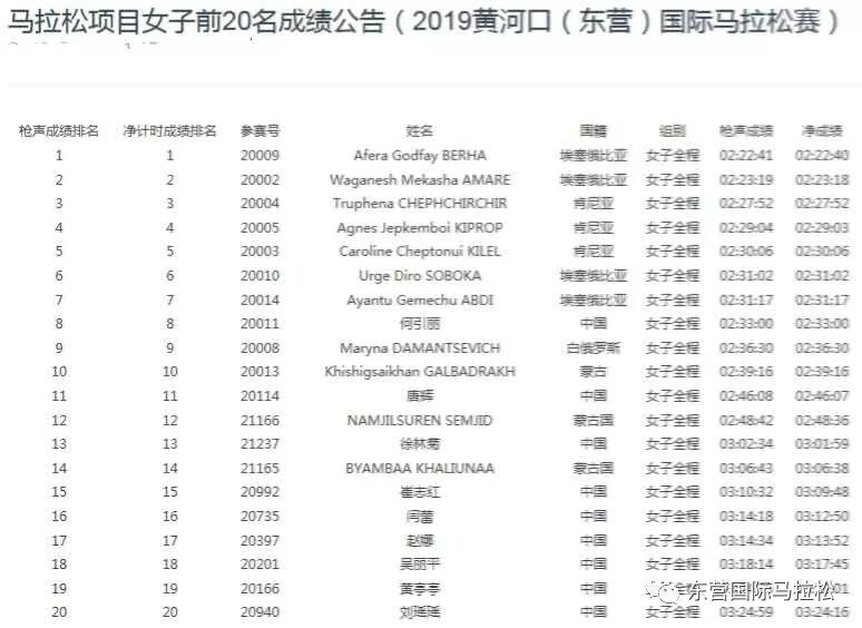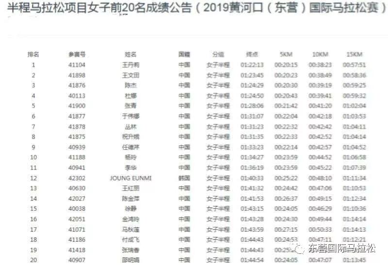 半程马拉松女子前20名(具体获奖名次请参照竞赛规程)