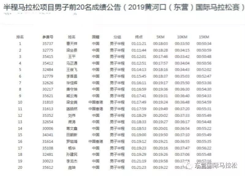 半程马拉松男子前20名(具体获奖名次请参照竞赛规程)
